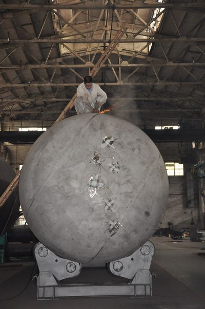 今年,容器公司的一個(gè)重點(diǎn)項(xiàng)目就是CS2120D一百二十立方米臥式液氫槽車的制作,其技術(shù)難度非常大,堪稱是一次前所未有的遭遇戰(zhàn)。對(duì)于這項(xiàng)艱巨的任務(wù),擅打硬仗的蔡于、朱德意作業(yè)組當(dāng)仁不讓,勇挑重?fù)?dān)。一接手,他們首先面臨的是施焊的難題。該產(chǎn)品內(nèi)筒母材含有16MN,所需焊絲特別軟,給焊接帶來(lái)相當(dāng)大的難度。面對(duì)難題,焊工師傅們迎難而上。大家集思廣益,謹(jǐn)慎施焊,每一個(gè)坡口都認(rèn)真清理,每一條焊道都仔細(xì)修磨,每一處施焊都小心翼翼,精益求精中,焊縫照光一級(jí)片合格率超過(guò)了百分之九十,為產(chǎn)品前期的順利進(jìn)行打下了一個(gè)堅(jiān)實(shí)地基礎(chǔ)。一百二十立方米臥式液氫槽車后期套裝的難點(diǎn)是安裝的銜接。冷作工師傅一邊制作的同時(shí)一邊與相關(guān)的設(shè)計(jì)工藝人員一道交流探討最佳方案。內(nèi)筒管路的走向、套管排位的選擇、支架裝配的定位等無(wú)不考驗(yàn)著人們本已緊繃的神經(jīng)。壓力下,大家并沒(méi)有沮喪與退縮,而是實(shí)實(shí)在在地邁開(kāi)了進(jìn)取的腳步。幾番上下的裝拆,幾番探索的嘗試,幾番糾結(jié)的交錯(cuò),終于,90度支架順利地安裝到位,幾十處支腳的焊接也圓滿無(wú)缺,無(wú)一漏點(diǎn),從而有效地保證了氦檢與抽真空的正常進(jìn)行。
