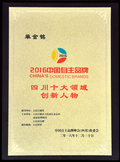 由人民日?qǐng)?bào)社人民論壇雜志社、國(guó)家治理周刊、人民論壇網(wǎng)組織的中國(guó)自主品牌活動(dòng),經(jīng)中國(guó)自主品牌峰會(huì)(四川)組委會(huì)及專家調(diào)研評(píng)審,(集團(tuán))公司董事長(zhǎng)、總經(jīng)理單金銘被評(píng)為2016中國(guó)自主品牌“四川十大領(lǐng)域創(chuàng)新人物”。