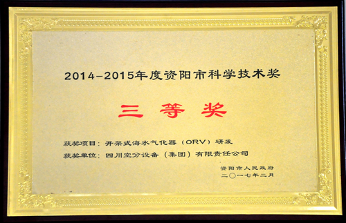由我公司研發(fā)的開架式海水氣化器(ORV),被資陽(yáng)市人民政府評(píng)為2014—2015年度資陽(yáng)市科學(xué)技術(shù)獎(jiǎng)三等獎(jiǎng)。