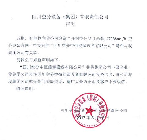 四川空分設(shè)備(集團(tuán))有限責(zé)任公司-------聲明