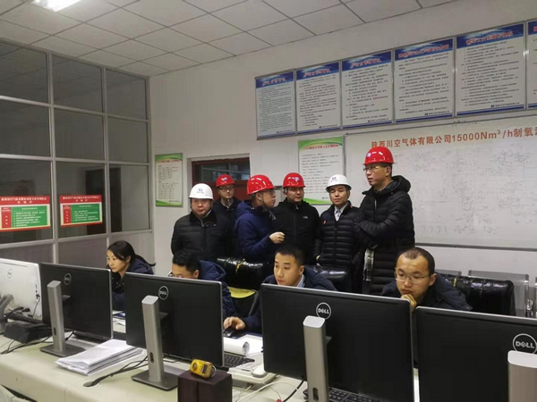 會議召開前,在陜川公司董事、總經理謝銀宇的陪同下,全體董事會成員對公司廠區(qū)內15000Nm3/h空分裝置的主體設備、中控室、后備系統(tǒng)液體儲槽和托管的略鋼6500Nm3/h空分裝置區(qū)域進行了全面視察,現場聽取了技術人員對生產運行、操作、質量把控等工作介紹。