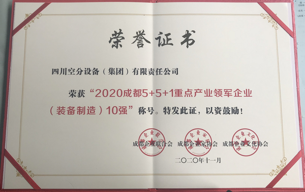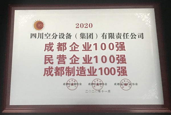近日,我公司榮獲2020年度“成都百強(qiáng)企業(yè)”“成都民營百強(qiáng)企業(yè)”“成都制造業(yè)百強(qiáng)企業(yè)”以及“2020成都5+5+1重點(diǎn)產(chǎn)業(yè)領(lǐng)軍企業(yè)(裝備制造)10強(qiáng)”等榮譽(yù)稱號(hào)。這代表著客戶、行業(yè)和社會(huì)對四川空分集團(tuán)的肯定和認(rèn)可。