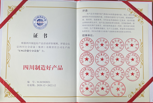 根據(jù)四川制造好產(chǎn)品活動評價規(guī)則,我公司生產(chǎn)的“LNG冷能空分設(shè)備”被評為“四川制造好產(chǎn)品”。目前該產(chǎn)品已取得發(fā)明專利3項、實用新型專利8項,獲得了四川省名牌產(chǎn)品稱號、四川省科技進步二等獎、四川省專利獎三等獎等榮譽。