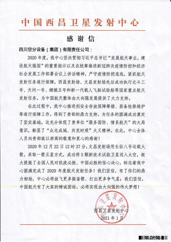 西昌衛(wèi)星發(fā)射中心給我公司發(fā)來感謝信——對我公司在中國航天事業(yè)發(fā)展中的貢獻(xiàn)表示感謝